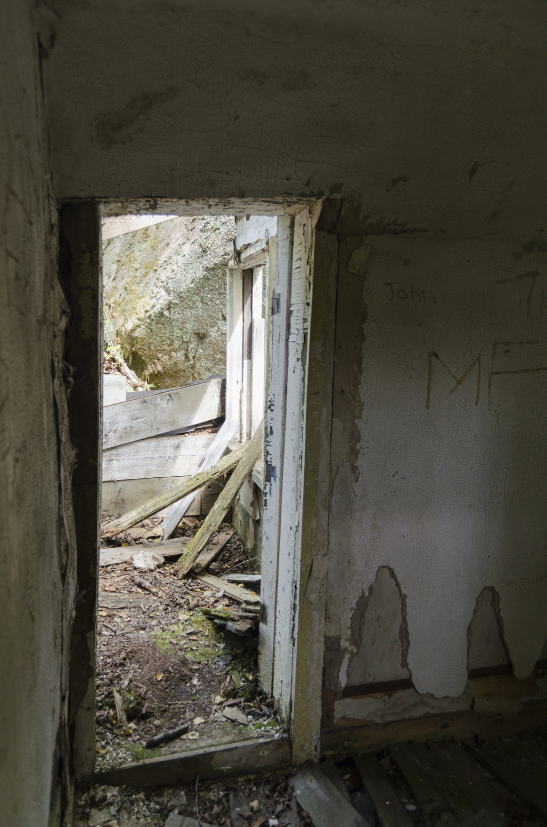 We watched a few of the new trains go past along the tracks as we explored. No one seemed surprised we were there. A couple of camps were still occupied, probably on a seasonal basis, and the signs of the town's former glory and becoming ever more difficult to find. Still painted in relatively small white letters on the rock face, however, was "Jackfish Ontario".