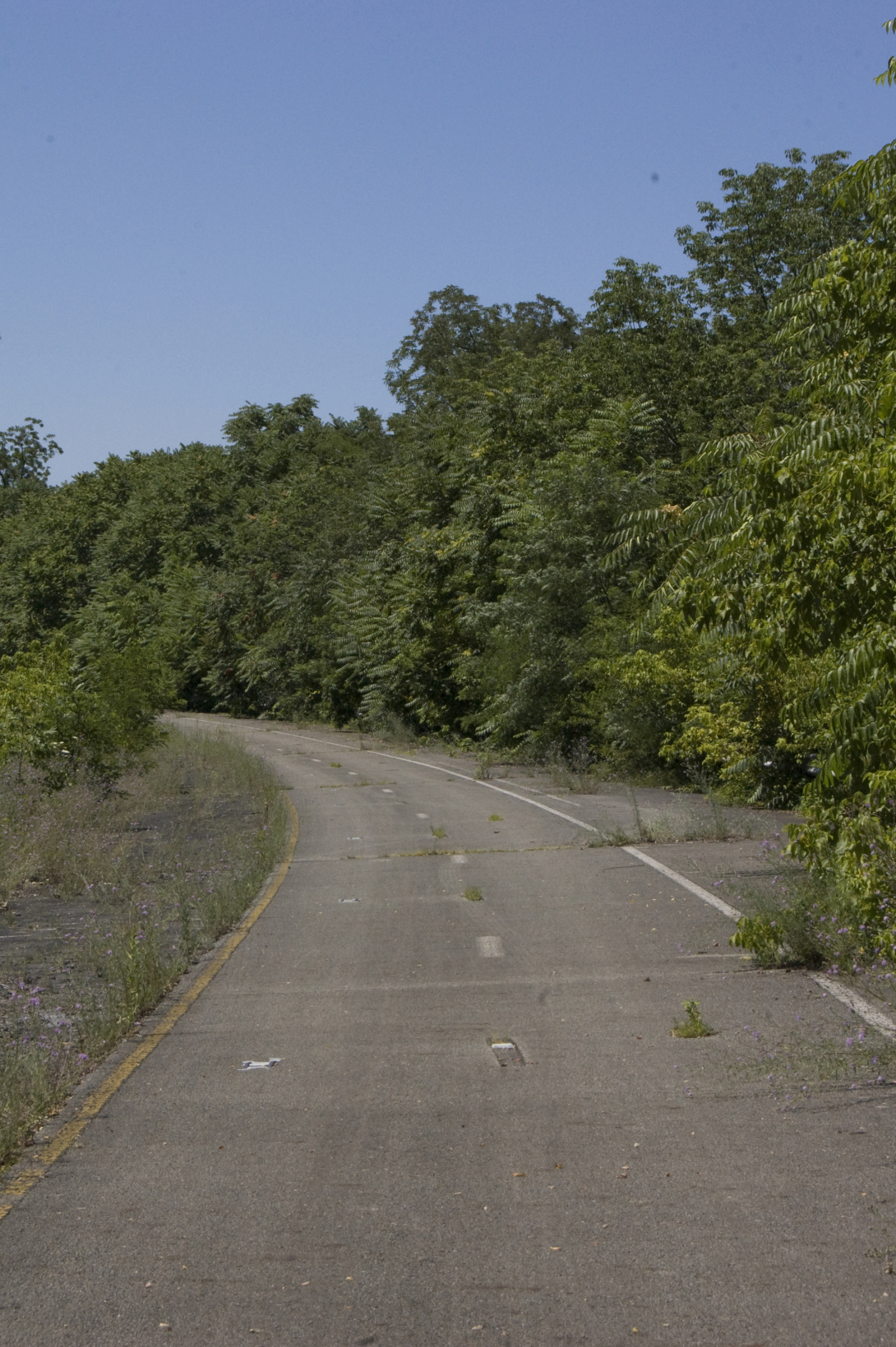 We scrambled up the side of the embankment to reach the level of the former highway and stepped over the guard-rail. Initially, we looked left and saw the curve of the road, already beginning to crack and sprout greenery. Looking right, we saw exactly what we were here to see.