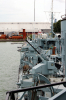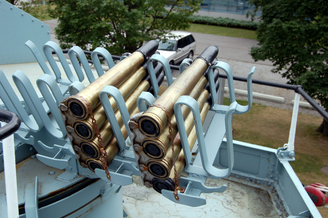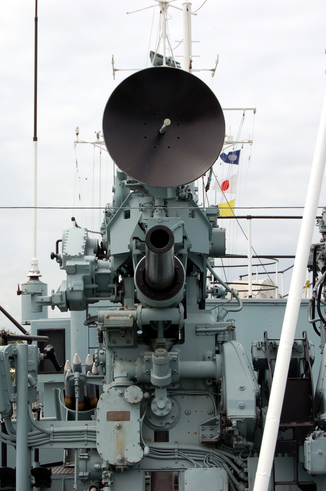 In 1947, with the Cold War already spinning up, HMCS Haida was brought in for modification with new electronics, and new weapons. Her 4.7" guns were replaced by Mk XVI 4" guns. One gun turret was replaced by two squid anti-submarine mortars, and she was equipped with a Mk 63 fire-control director.