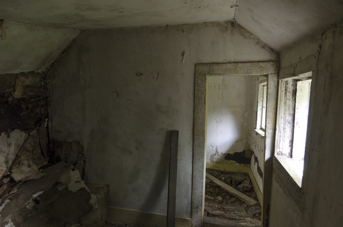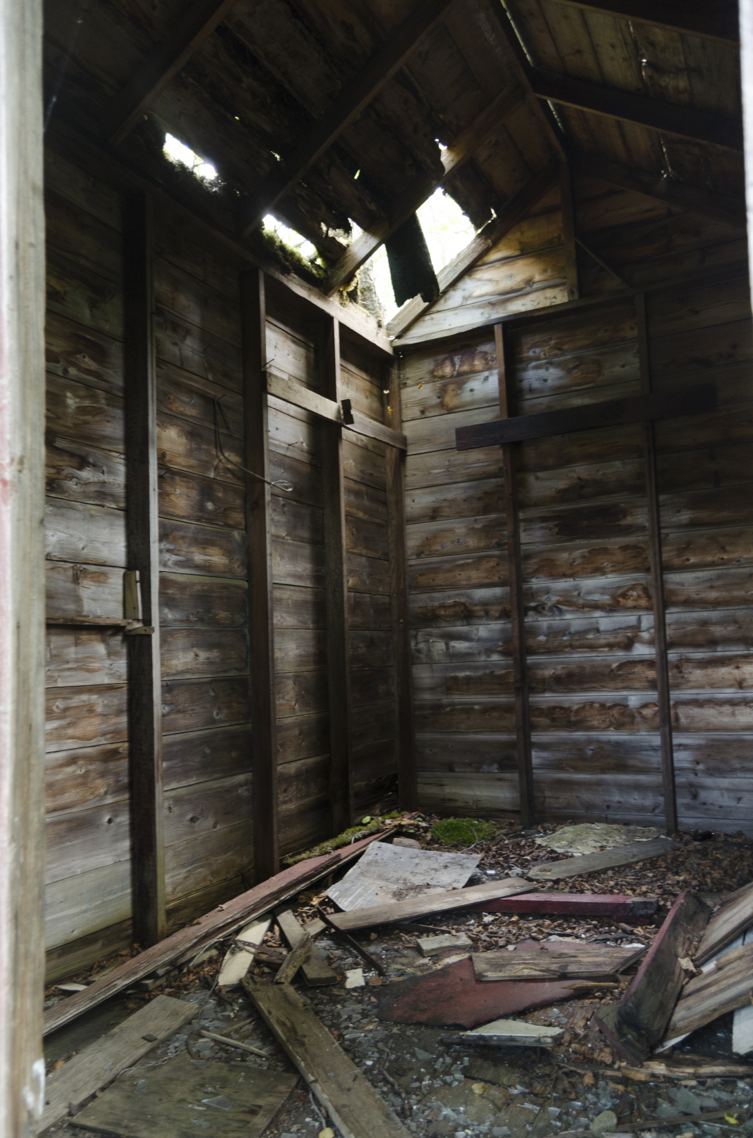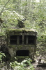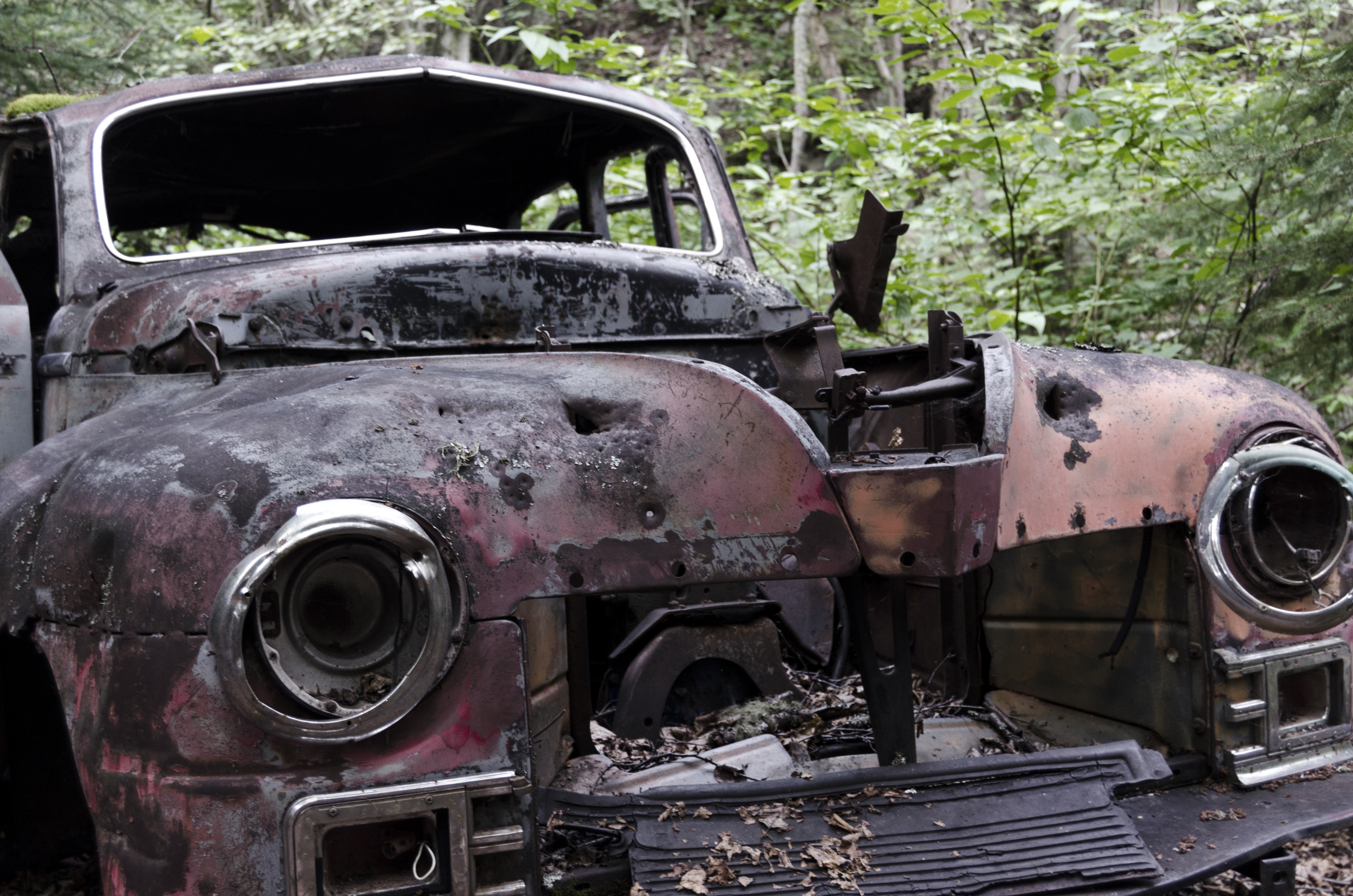 A little further along, on the north side of the track, we encountered the remains of a water tower. Not yet knowing the history of this place, I came to the conclusion that coal and water were the most likely reason for this town's existence. As we continued along, we began to notice other details. A ramp to raise a car for repairs. An old car. Open foundations with old furnaces cold and covered in moss.