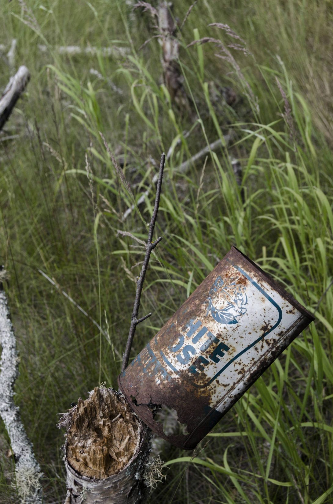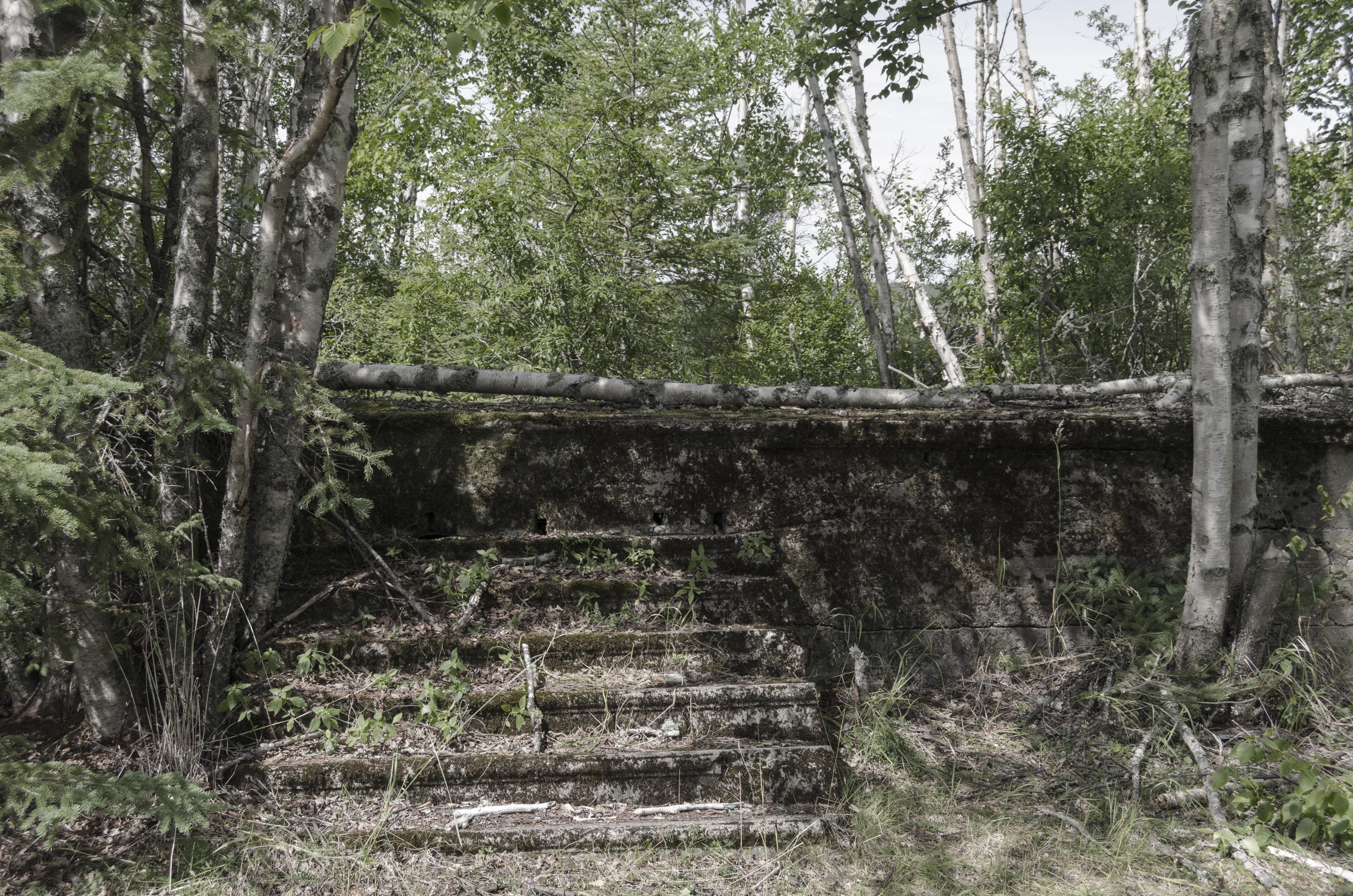 We watched a few of the new trains go past along the tracks as we explored. No one seemed surprised we were there. A couple of camps were still occupied, probably on a seasonal basis, and the signs of the town's former glory and becoming ever more difficult to find. Still painted in relatively small white letters on the rock face, however, was "Jackfish Ontario".