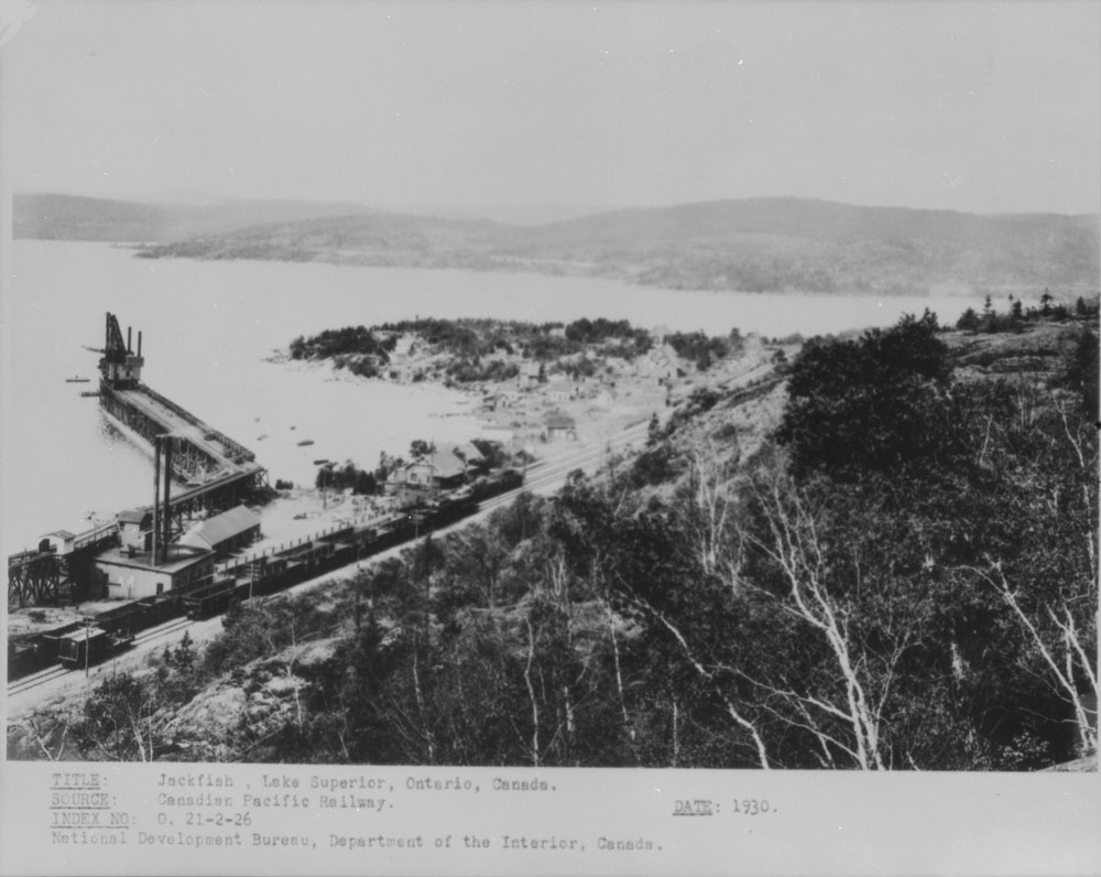 Jackfish existed before the CPR came along, mostly as a small fishing community. It was the railway, however, that caused it rapid and immense growth. Between 1883 and 1885, the railway, and a siding, were constructed here allowing the passing of trains in opposite directions. After almost a decade, a port was established for the unloading of coal, building Jackfish up into a recoaling and watering station for the CPR's steam engines, here and in Shreiber and White River.